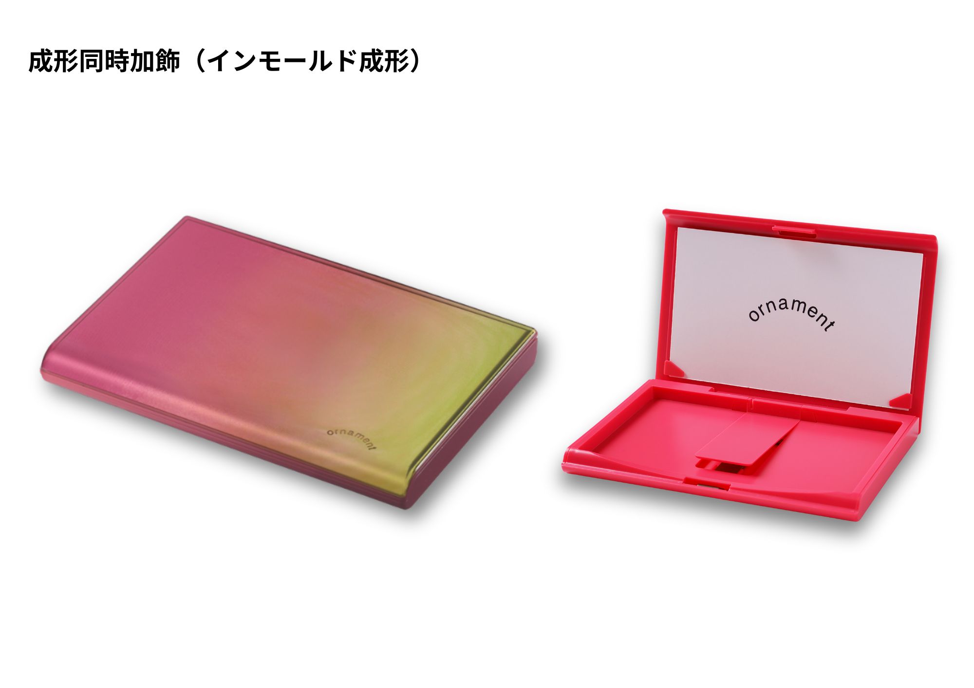 ②成形と同時に加飾する技術(インモールド成形)。製品例:通信機器の外装パネル、収納容器等。