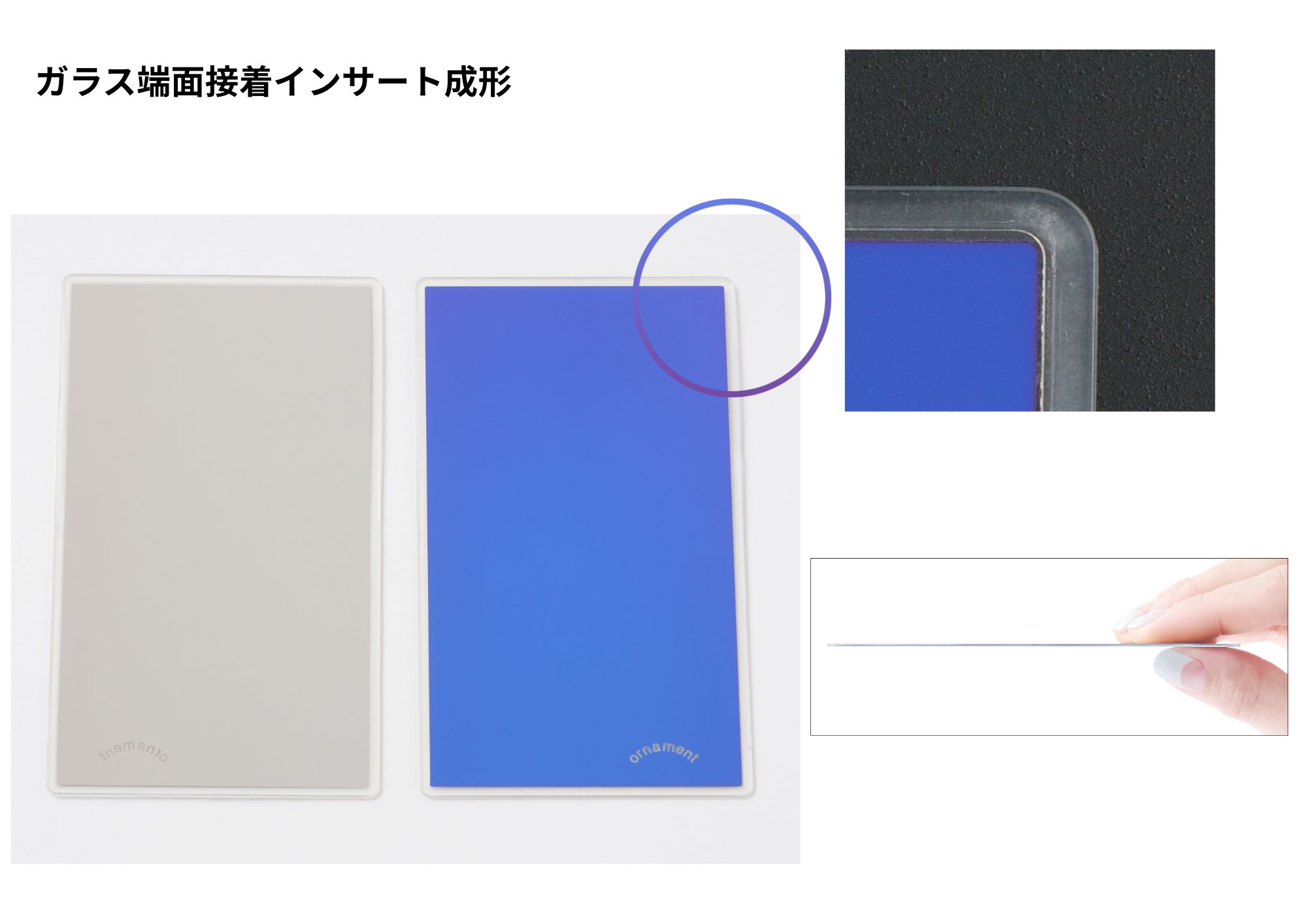 自社製品:ミラー(ガラス端面接着インサート成形)、カードケース(インモールド成形)