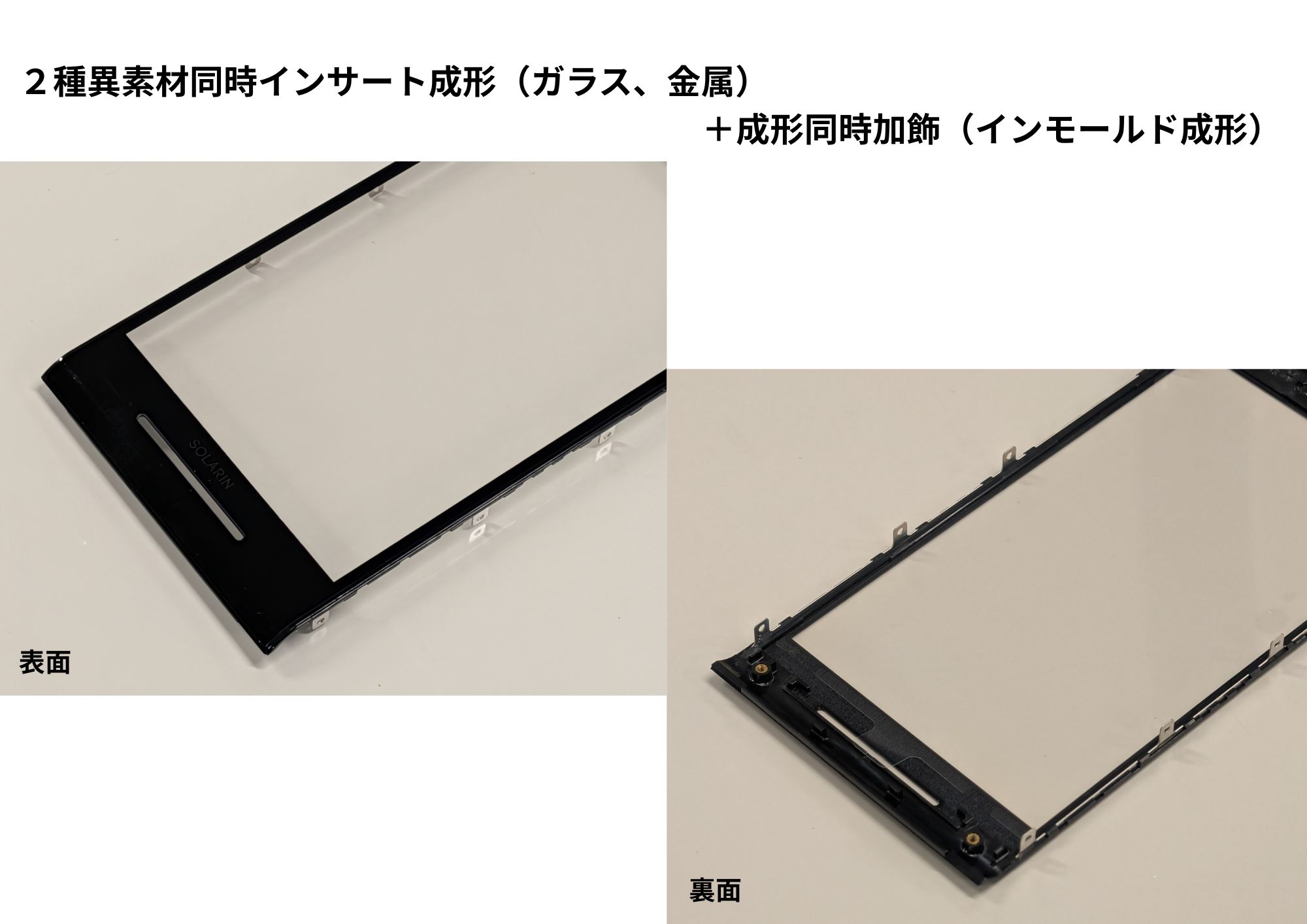 得意技術:①異素材(ガラス、金属など)をインサート成形する技術。製品例:モニター等の表示パネル、通信機器の表示パネル、センサー用内部パネル。